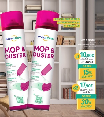 LAISSE UN PARFUM FRAIS AUX NOTES FLORALES ET ORIENTALES MOP & DUSTER 400 ml Régénérateur d’efficacité pour accessoires en tissu X1 10,90€ 12,90 € (27,25€/L) Offre 80669 OFFRE 15% RÉDUCTION X2 17,90€ 25,80 € (22,38€/L) Offre P242 OFFRE 30% RÉDUCTION