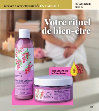 Plus de détails recevez 2 serviettes invités EN CADEAU ! page 24 Votre rituel de bie de bie de bien-êtren-êtren-êtren-être de bie Huile Essentielle ile Essentielle ile Essentielle Hu Hu de Baies Rosesaies Roses de B de Baies Roses 27