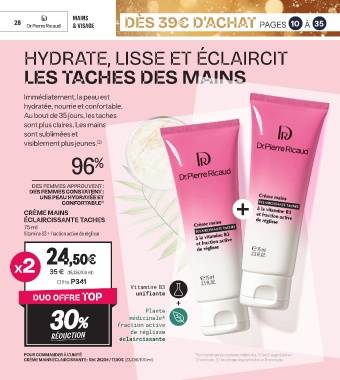 CRÈME MAINS ÉCLAIRCISSANTE : Réf. 26234 / 17,50€ (23,33€/100 ml) 27 volontaires. (2) Test clinique objectivé réalisé sur 19 volontaires.